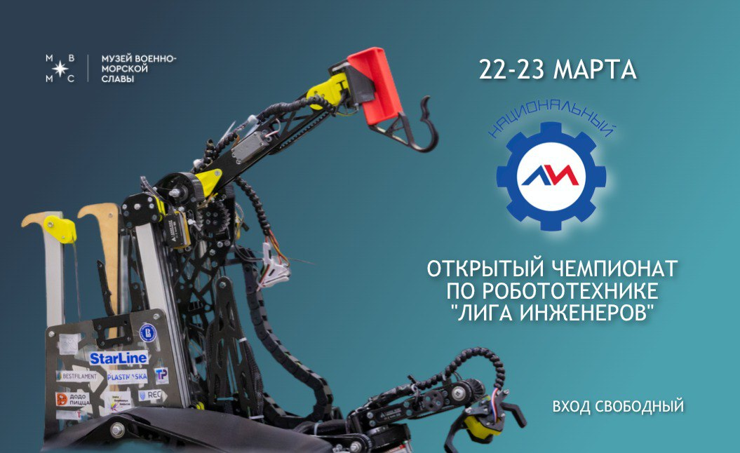 Национальный этап открытого чемпионата по робототехнике «Лиги Инженеров» прошел в музее Военно-морской славы 22 и 23 марта. Это образовательная программа, которая направлена на развитие инженерного потенциала молодёжи. В состязании участвовали команды из Санкт-Петербурга, Москвы, Красноярска, Иркутска, Перми, Екатеринбурга, Краснодара, Саратова, Ленинградской и Московской областей и из Республики Беларусь.